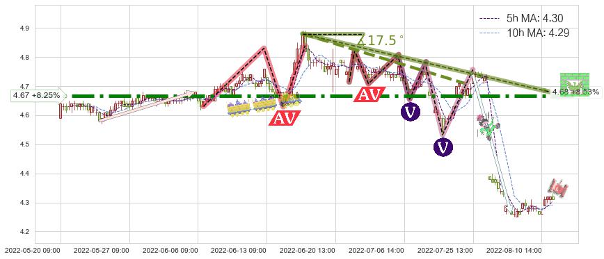 ♘ 阻力价格位4.67,可信任强度93.41%,距离最后交易2022-08-12 14:00形成的收盘价格4.31相差 +8.25%