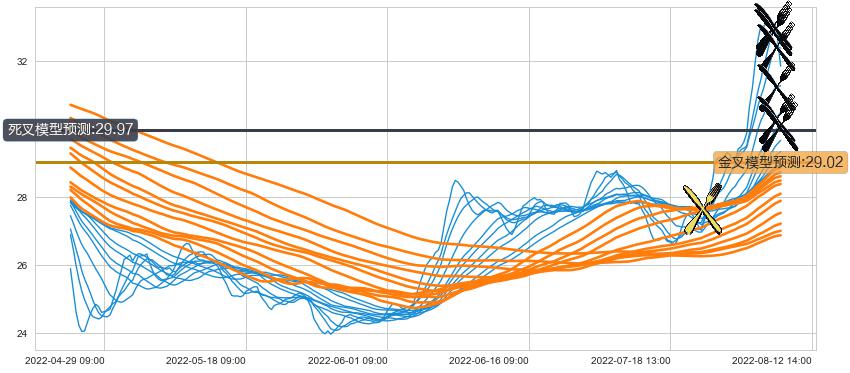 ➢ 13小时均线于(08-11 14:00: 32.38)形成【死叉】基于【死叉历史模型】预测死叉后最低波谷价格: 31.49, 死叉后最低价格29.87,已经下跌超出预测最低波谷价格, 预期反弹