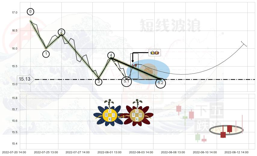 ➣ 5.1: 预测当前第5浪位置(08-10:13, 15.13),仍然有下跌空间