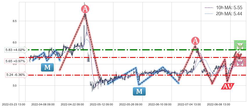 ♘ 阻力价格位5.83,可信任强度81.89%,距离最后交易2022-08-12 14:00形成的收盘价格5.60相差 +4.02%