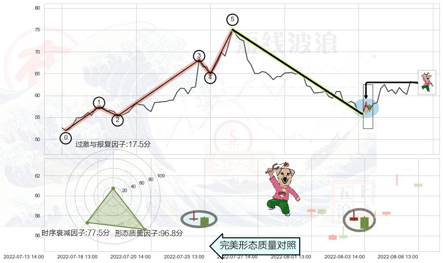 从2022-06-14 11:00至2022-07-22 14:00,共包含67个小时,阶段股价上涨19.16%,阶段股价变动位移路程比: 1 : 5,上涨趋势角度: 57.5
