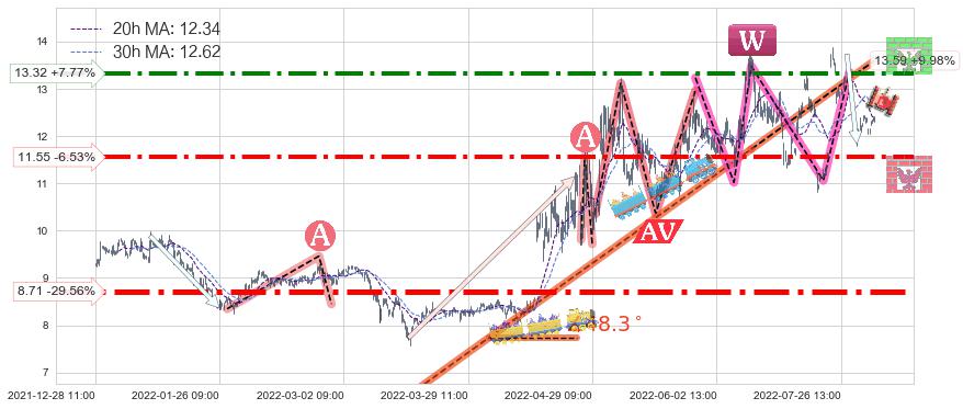 ♘ 阻力价格位13.32,可信任强度80.81%,距离最后交易2022-08-12 14:00形成的收盘价格12.36相差 +7.77%