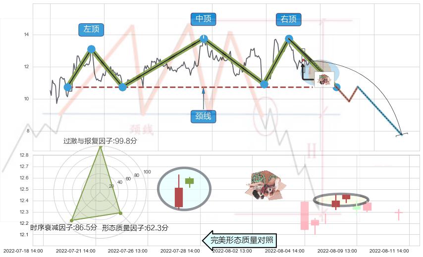 ➢ 🕰 价格走势在2022-08-08 13:00:00至2022-08-08 14:00:00期间形成顶部尽头线(下山虎),残存影响值:-7.03