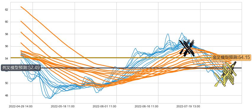 ➢ 60小时均线于(07-05 14:00: 55.86)形成【死叉】基于【死叉历史模型】预测死叉后最低波谷价格: 53.20, 死叉后最低价格49.46,已经下跌超出预测最低波谷价格, 预期反弹