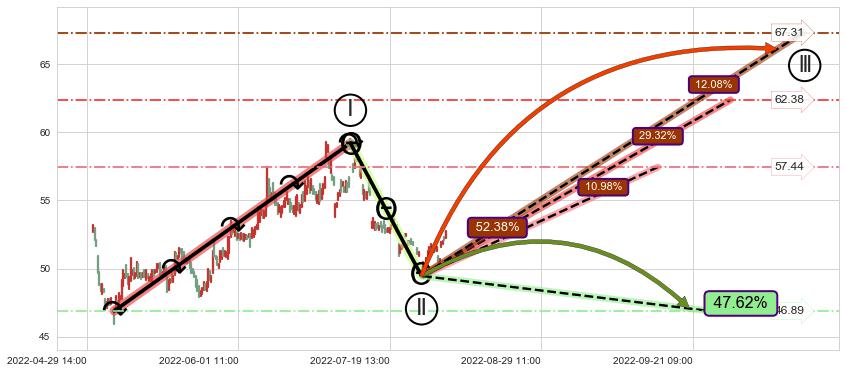 ➢ 循环浪继续向上【最低】位置(09-15:10, 57.44),匹配聚类样本比例20.97%, 可能性概率10.98%