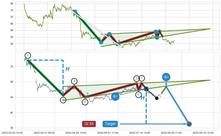 ➣ D点拟合预测价格69.95,距离最后交易收盘价格52.58相差 +33.04%