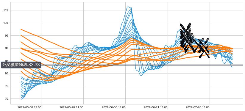 ➣ 40小时均线于(07-07 14:00: 91.97)形成【死叉】基于【死叉历史模型】预测死叉后最低波谷价格: 84.25, 死叉后最低价格82.20,已经下跌超出预测最低波谷价格, 预期反弹