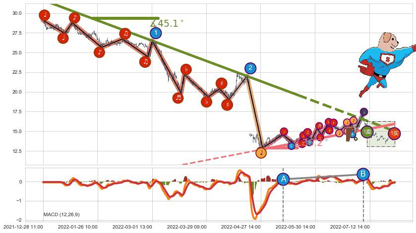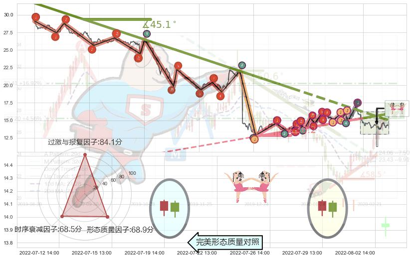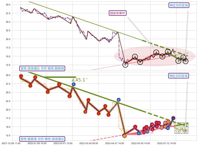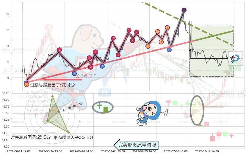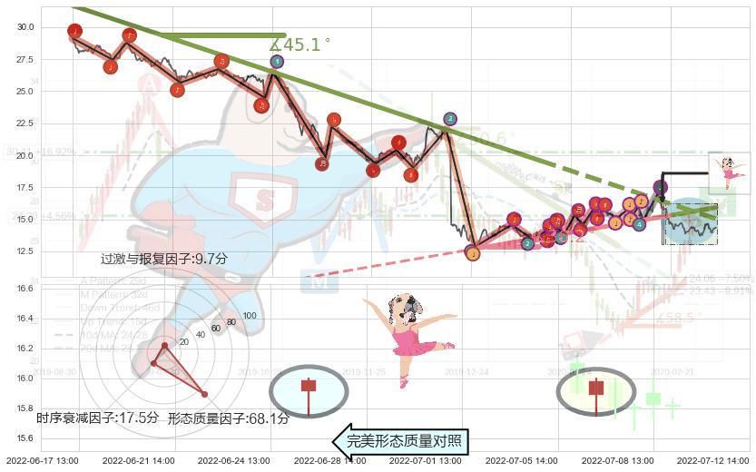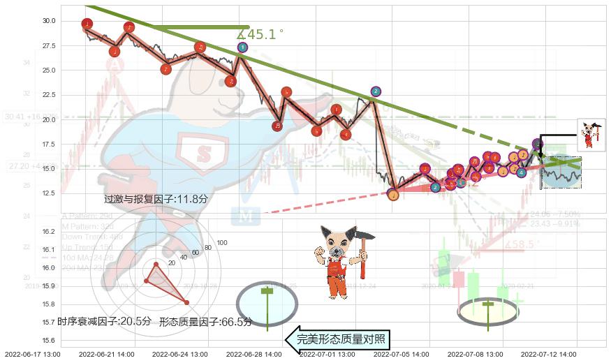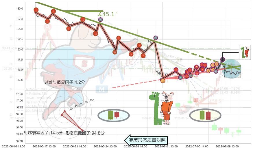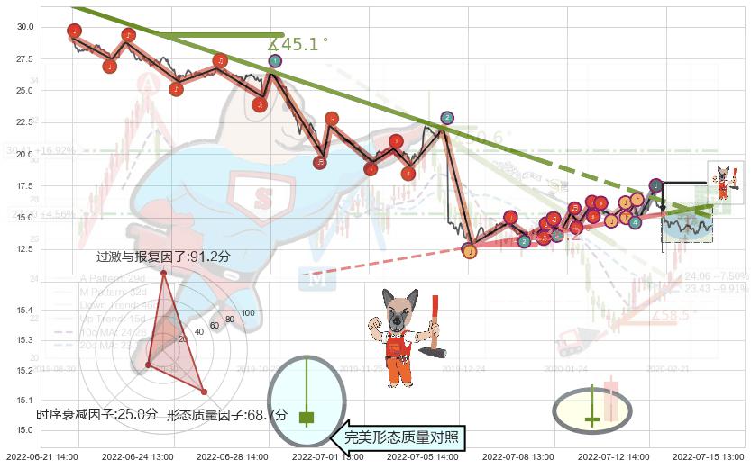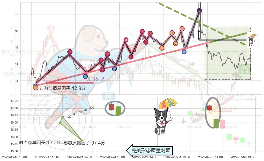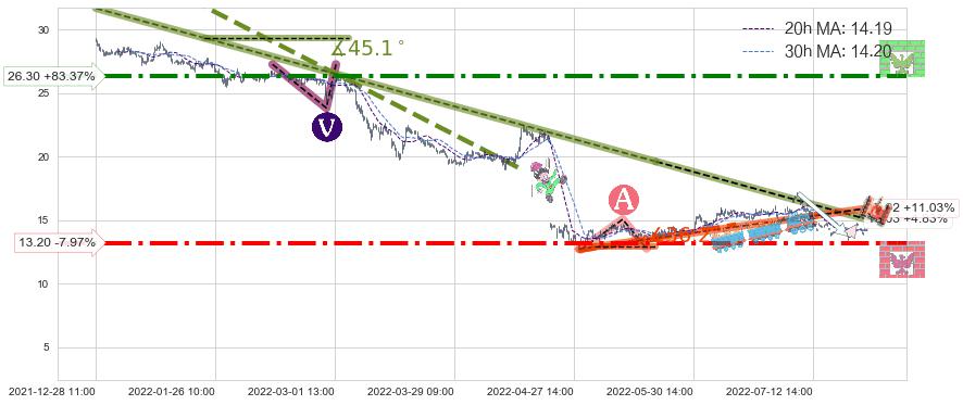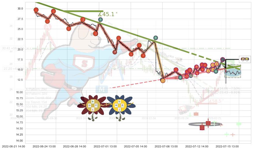 ➣ 2022-04-28 13:00-2022-07-13 14:00上升趋势存在反转[风险],其原上升趋势的支撑位(15.92)已破位[强阻力信号],原上升趋势角度: 36.2˚