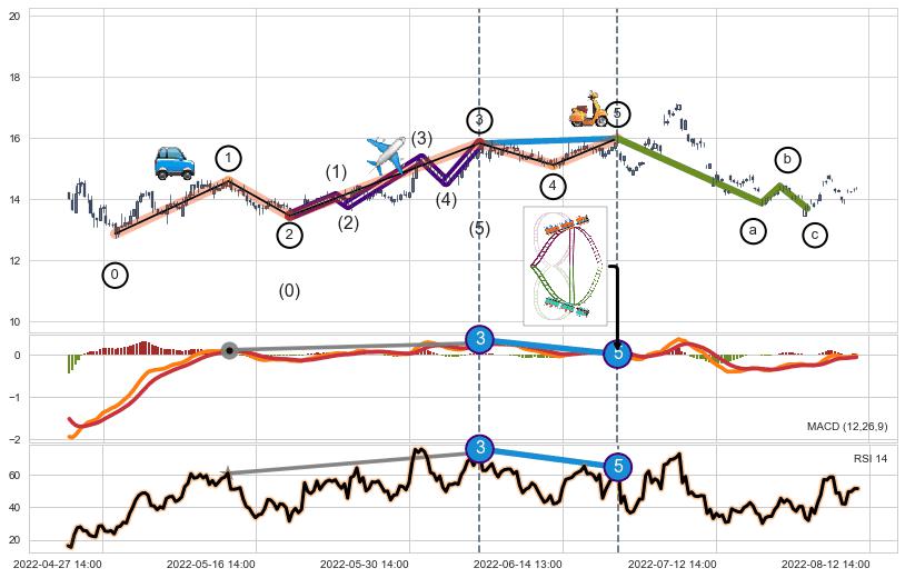 ➢ 最后的上涨趋势2022-04-28 13:00至2022-07-13 14:00:存在破位迹象,后续小调整或者反转下跌