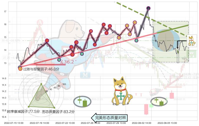 从2022-04-28 13:00至2022-07-13 14:00,共包含199个小时,阶段股价上涨14.83%,阶段股价变动位移路程比: 1 : 12,上涨趋势角度: 36.2