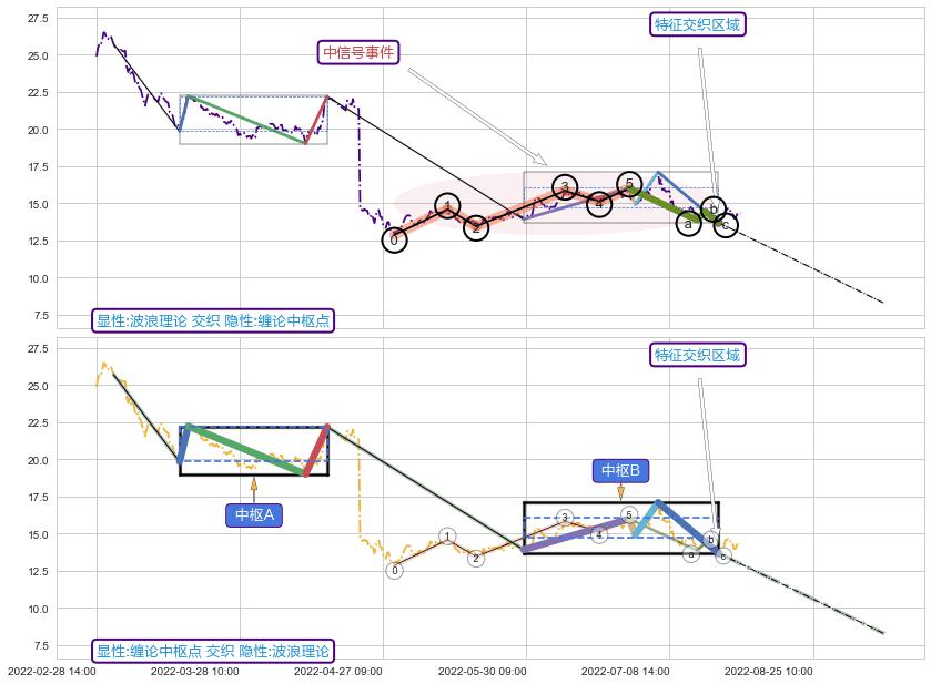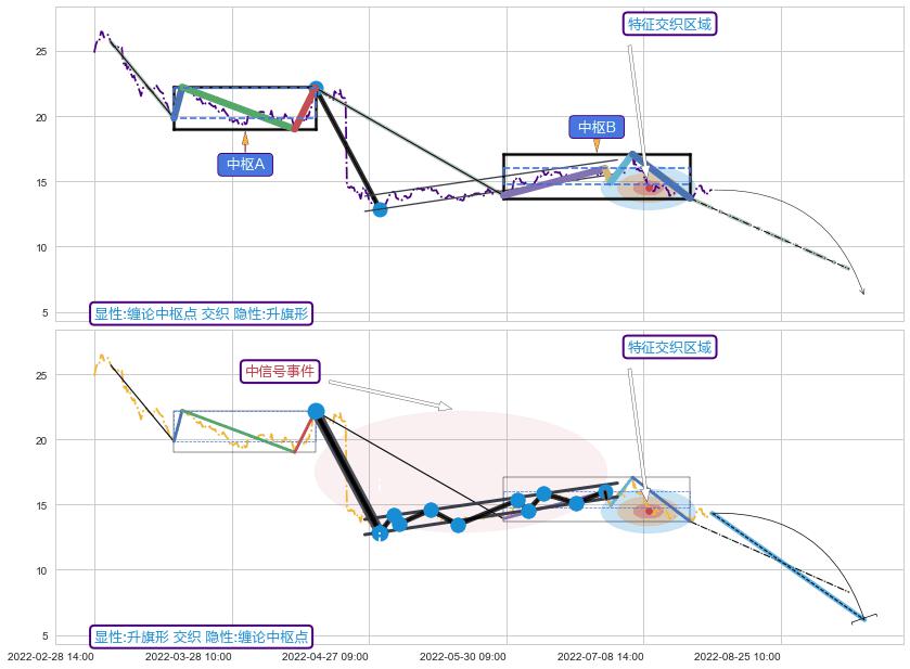 ➣ 缠论中枢点:猜想破位中枢B后持续下拉 → 下跌 → 破位中枢B支撑 → 持续趋势跟踪