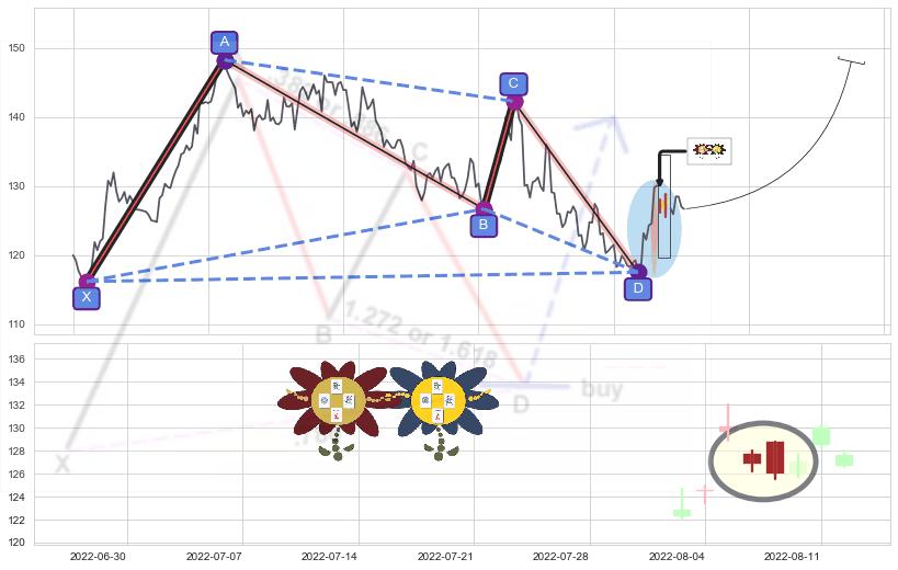 ➢ 谐波伽利:c下跌到达d:猜想拉升 → 上涨 →【拐点】强支撑临近 → 大趋势均值回复