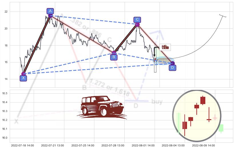 ➢ 谐波伽利:c下跌临近d:猜想拉升 → 上涨 →【拐点】强支撑临近 → 大趋势均值回复