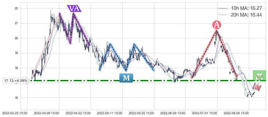 2022-07-22: 第一阻力位17.13有效抑制了下跌浪,成功阻止了价格的继续下跌。