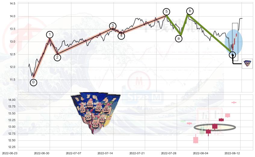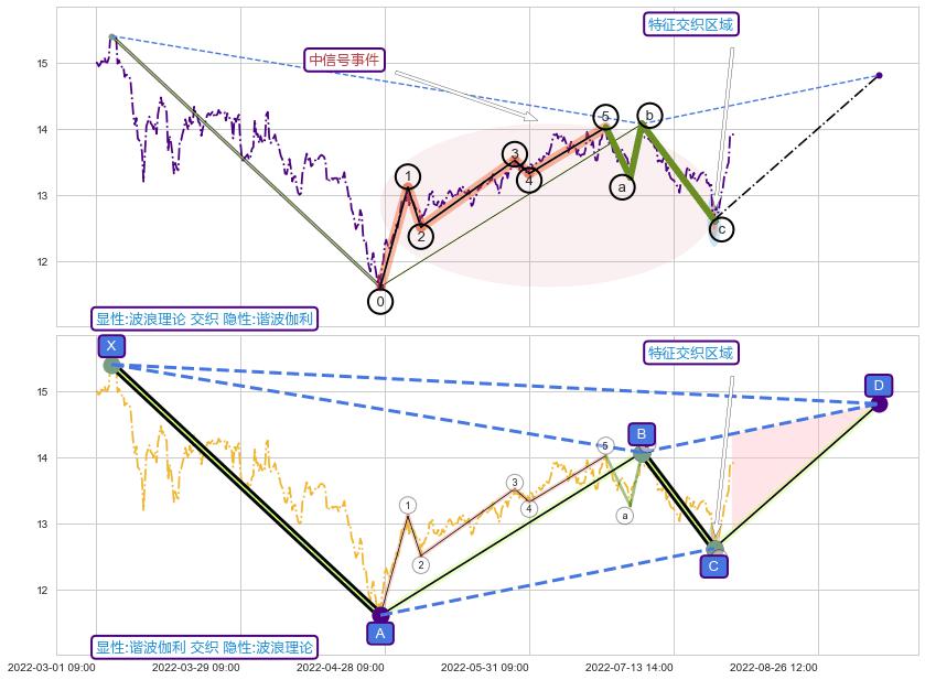从2022-07-15 14:00至2022-08-12 14:00,共包含39个小时,阶段股价上涨6.76%,阶段股价变动位移路程比: 1 : 3