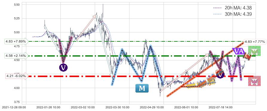 ♘ 阻力价格位4.58,可信任强度81.60%,距离最后交易2022-08-12 14:00形成的收盘价格4.48相差 +2.14%