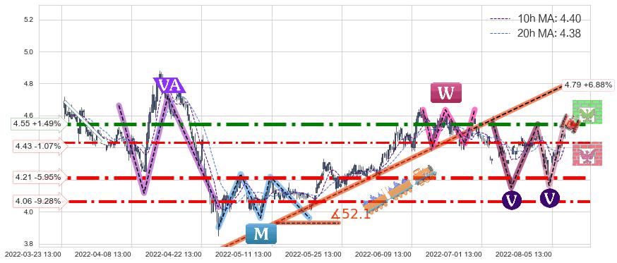 ♘ 阻力价格位4.55,可信任强度93.80%,距离最后交易2022-08-12 14:00形成的收盘价格4.48相差 +1.49%
