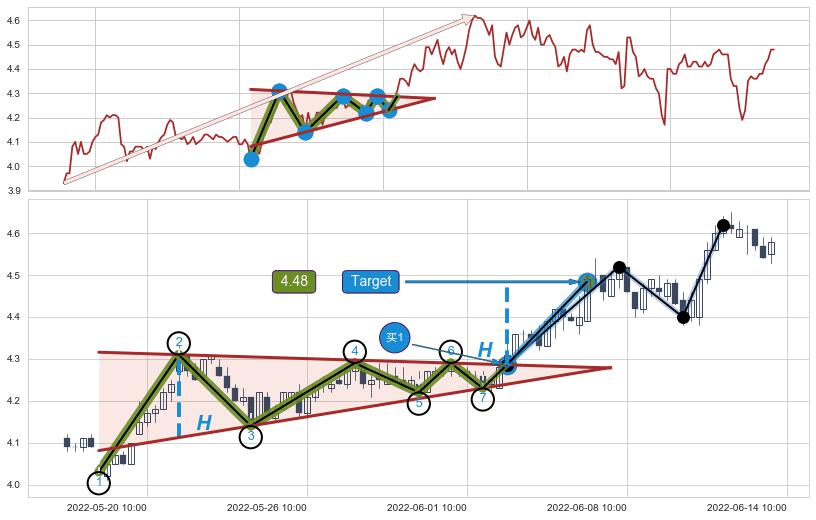 ➢ 最小中继整理涨幅→𝐇: 0.197931 (高点逐步降低斜边第一阻力点②与支撑边垂直距离)