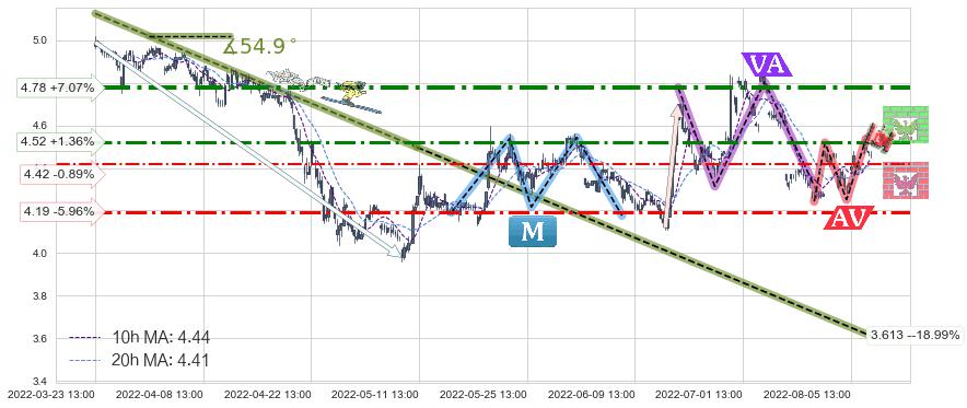 ♘ 阻力价格位4.52,可信任强度64.81%,距离最后交易2022-08-12 14:00形成的收盘价格4.46相差 +1.36%