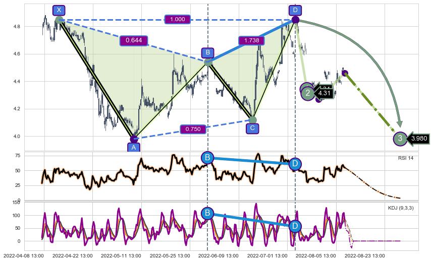➢ 谐波价格D点比B点高 ⤴,【KDJ】指标D点比B点低 ⤵️
