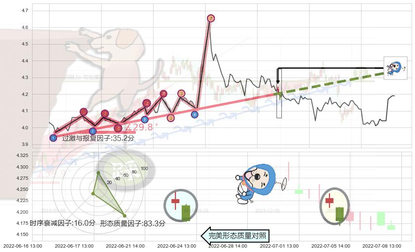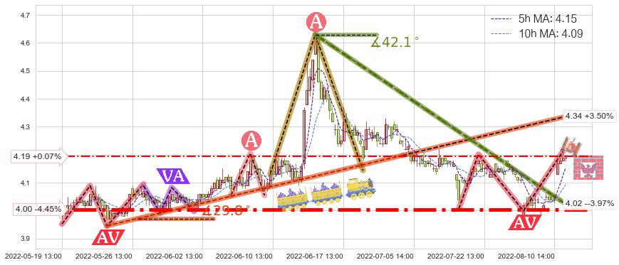 ➣ 2022-05-24 14:00-2022-07-01 14:00上升趋势存在反转[风险],其原上升趋势的支撑位(4.34)已破位[强阻力信号],原上升趋势角度: 29.8˚
