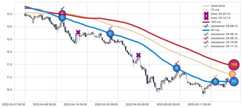 ➢ 最优均线组合共正确确认支撑阻力信号15处,正确确认率 75.00%