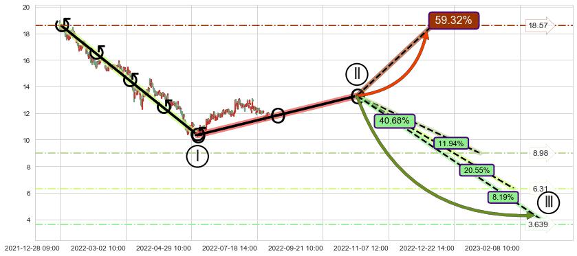 ➣ D点拟合预测价格13.70,距离最后交易收盘价格11.96相差 +14.57%