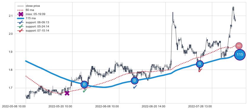 ➢ 最优均线组合共正确确认支撑阻力信号10处,正确确认率 71.43%