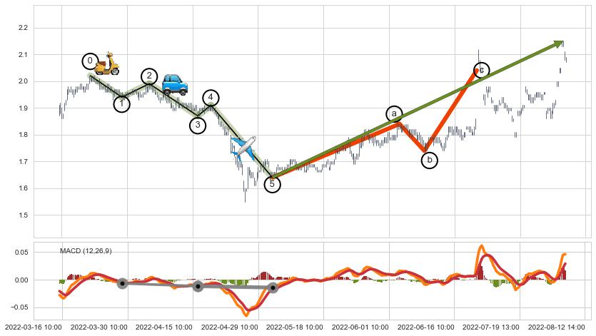 ➢ 波浪理论:猜想击穿突破c点后继续上涨 → 上涨 → 机会信号 → 小趋势跟踪