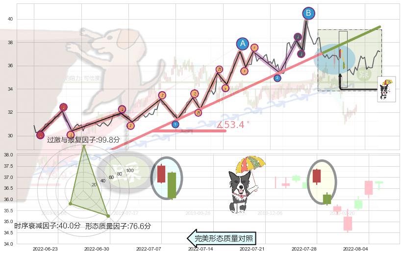➢ 2022-05-19 13:00-2022-07-21 14:00上升趋势存在反转[风险],其原上升趋势的支撑位(39.33)已破位[强阻力信号],原上升趋势角度: 53.4˚