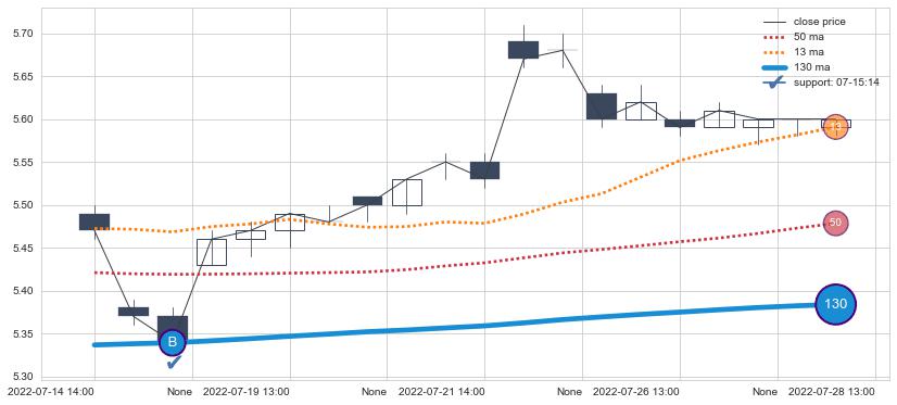 ➢ 13小时均线于(07-28 14:00: 5.60)形成【死叉】基于【死叉历史模型】预测死叉后最低波谷价格: 5.51, 死叉后最低价格5.59,尚未达到预测最低波谷价格, 预期继续下跌