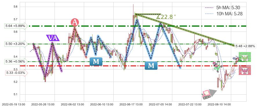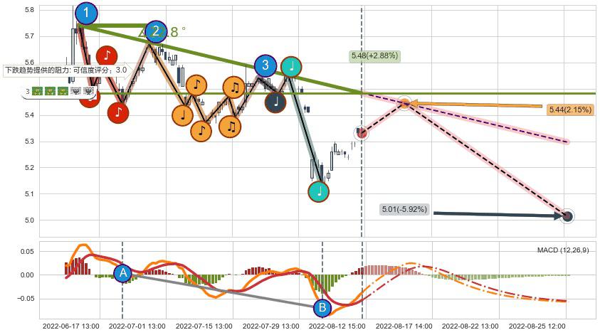 ♘ 阻力价格位5.50,可信任强度46.70%,距离最后交易2022-08-12 14:00形成的收盘价格5.33相差 +3.20%