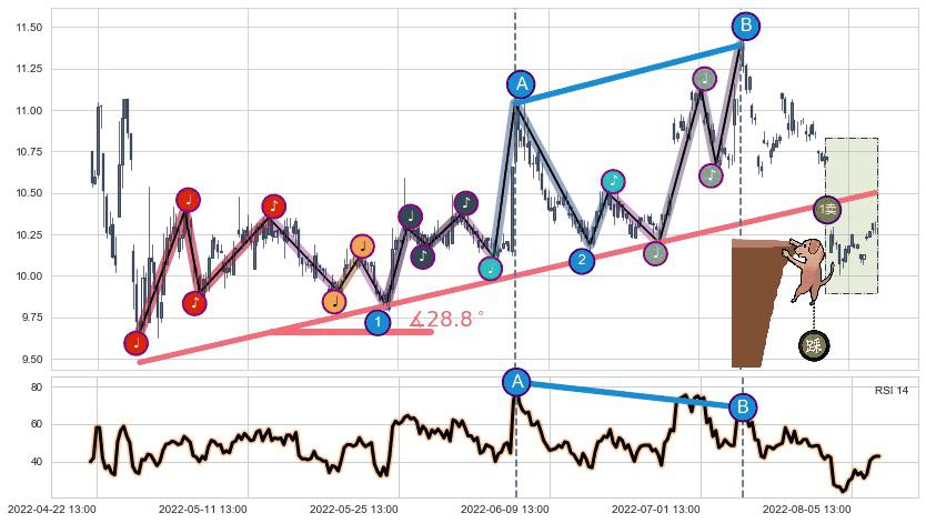 ➢ 最后的上涨趋势2022-04-27 11:00至2022-07-15 13:00:存在破位迹象,后续小调整或者反转下跌
