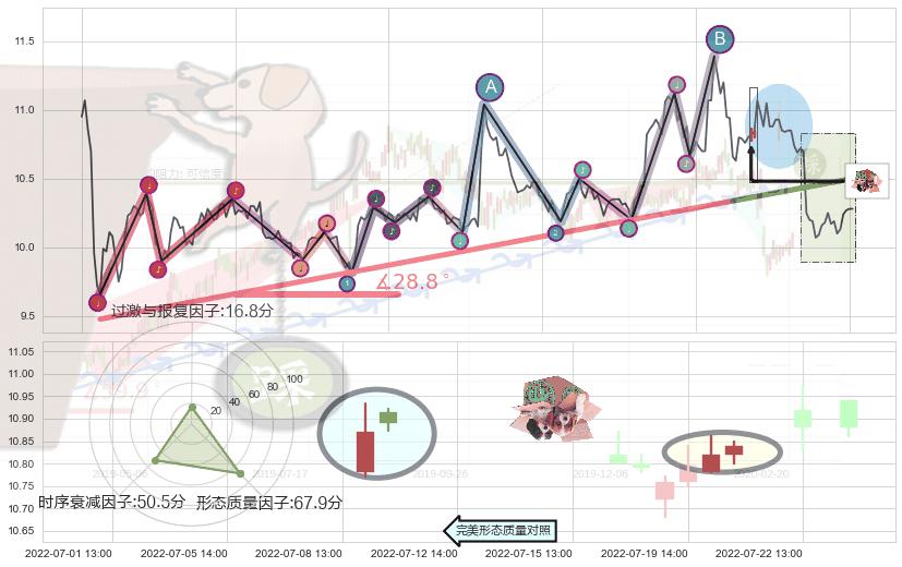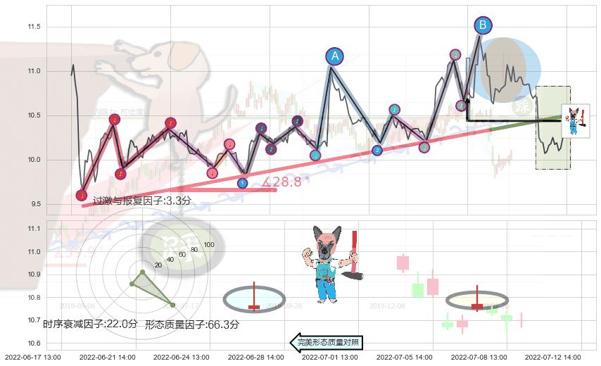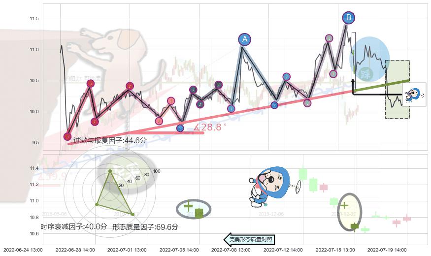 ➢ 2022-04-27 11:00-2022-07-15 13:00上升趋势存在反转[风险],其原上升趋势的支撑位(10.50)已破位[强阻力信号],原上升趋势角度: 28.8˚