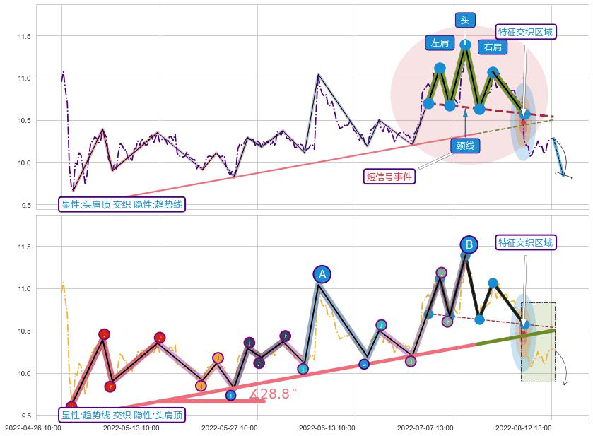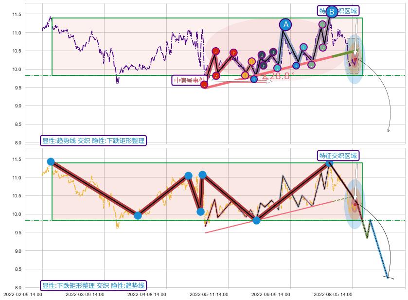 从2022-07-12 13:00至2022-08-12 14:00,共包含46个小时,阶段股价下跌-9.98%,阶段股价变动位移路程比: 1 : 3,2022-08-02 13:00向↘︎形成缺口,跳空下跌-4.21%˚