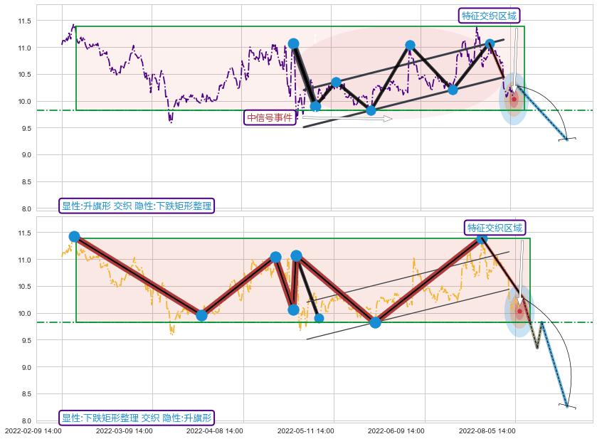 ➣ 下跌矩形整理:猜想临近关键支撑位突破点 → 临近拐点下跌 → 风险信号 → 大趋势均值回复