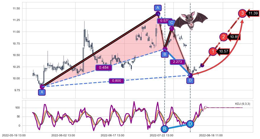 ➣ 谐波蝙蝠:c下跌到达d:猜想拉升 → 上涨 →【拐点】强支撑临近 → 大趋势均值回复