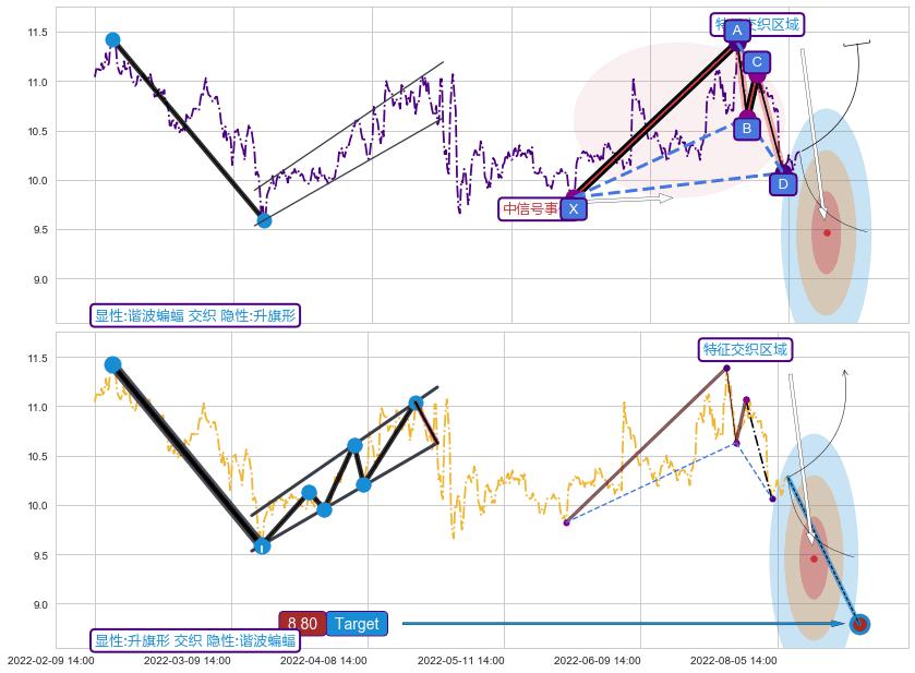 从2022-07-21 13:00至2022-08-12 14:00,共包含32个小时,阶段股价下跌-7.24%,阶段股价变动位移路程比: 1 : 2,2022-08-02 13:00向↘︎形成缺口,跳空下跌-4.21%˚
