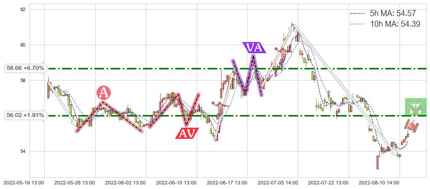 ♘ 阻力价格位56.02,可信任强度62.98%,距离最后交易2022-08-12 14:00形成的收盘价格54.97相差 +1.91%