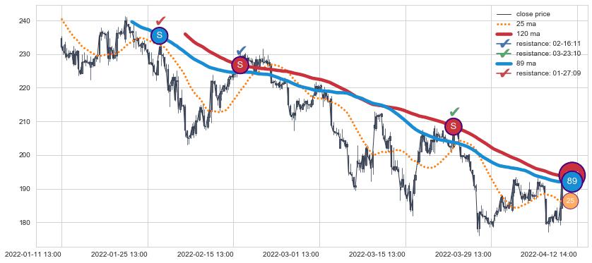 ➢ 89小时均线于(07-28 14:00: 228.78)形成【死叉】基于【死叉历史模型】预测死叉后最低波谷价格: 213.54, 死叉后最低价格213.17,虽然已经到达预测最低波谷价格,但耗时间很短动能很强, 预期继续下跌
