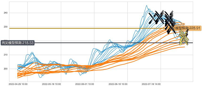 ➢ 70小时均线于(07-26 14:00: 231.80)形成【死叉】基于【死叉历史模型】预测死叉后最低波谷价格: 218.71, 死叉后最低价格213.17,已经下跌超出预测最低波谷价格, 预期反弹