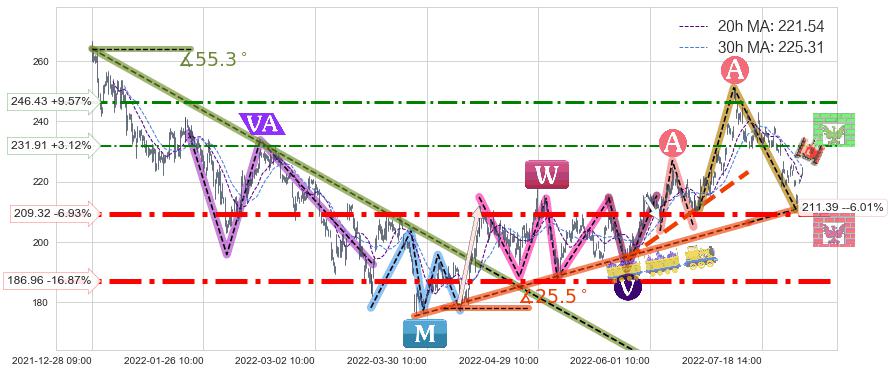 ♘ 阻力价格位231.91,可信任强度54.43%,距离最后交易2022-08-12 14:00形成的收盘价格224.90相差 +3.12%