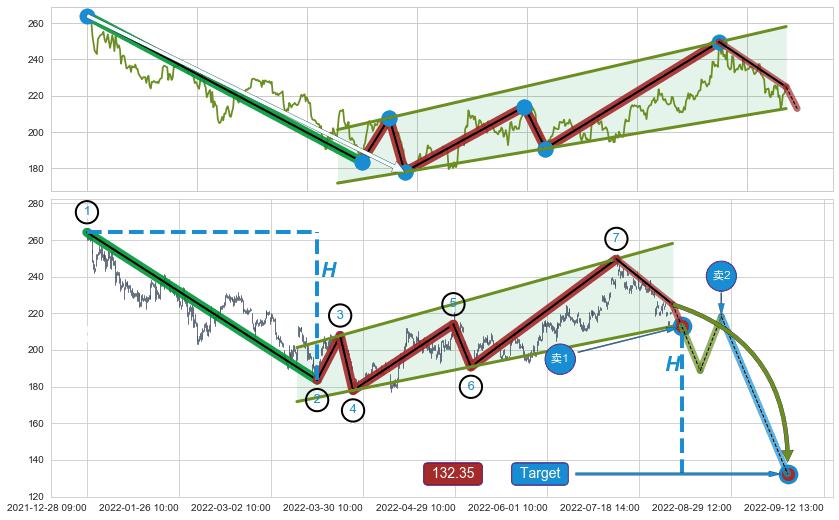 ➣ 升旗形:猜想临近关键支撑位突破点 → 临近拐点下跌 → 风险信号 → 大趋势均值回复
