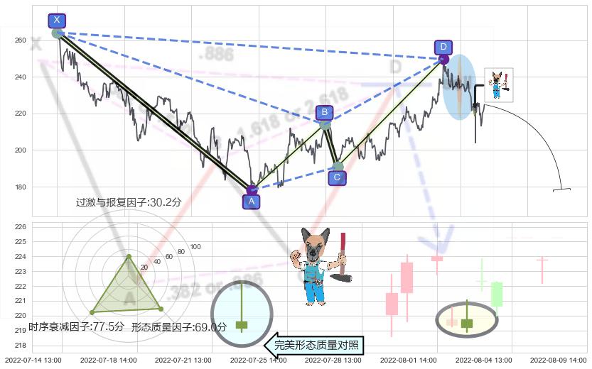 ➣ 下跌螺旋桨 + 谐波蝙蝠d拐点下跌阻力信号叠加后【目标达成率】中等,【看空】信号叠加【存续影响中等】