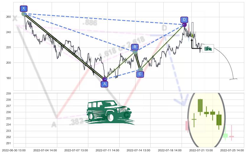 ➣ 谐波蝙蝠:c上拉到达d:猜想下沉 → 下跌 →【拐点】强阻力临近 → 大趋势均值回复