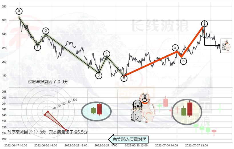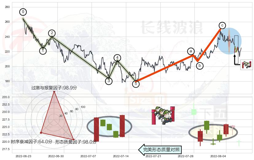 ➣ 看跌(高位倒锤头)流星线 + 波浪理论c点反弹终止反转下跌信号叠加后【反向回撤率】极低,【看空】信号叠加【存续影响极大】