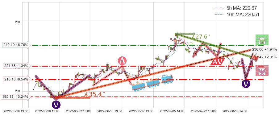 ♘ 阻力价格位240.10,可信任强度63.00%,距离最后交易2022-08-12 14:00形成的收盘价格224.90相差 +6.76%