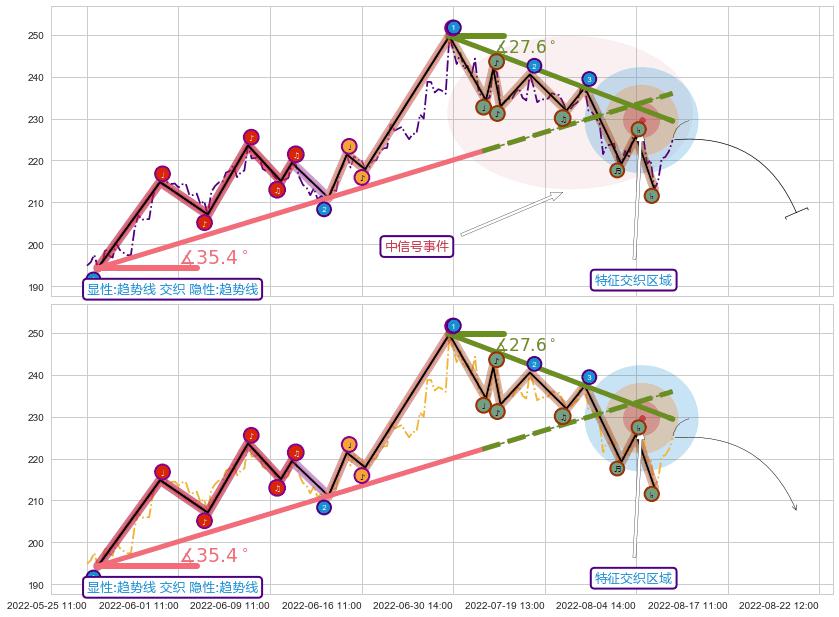 ➢ 2022-05-26 09:00-2022-07-06 14:00上升趋势存在反转[风险],其原上升趋势的支撑位(236.00)已破位[强阻力信号],原上升趋势角度: 35.4˚