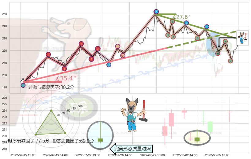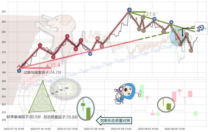 ♘ 在最后的下跌阶段2022-06-30 13:00至2022-08-12 13:00,存在 持续未破位的阻力位 ,阻力价格229.42,可信任强度68.25%,其距离最后价格224.90相差 +2.01%