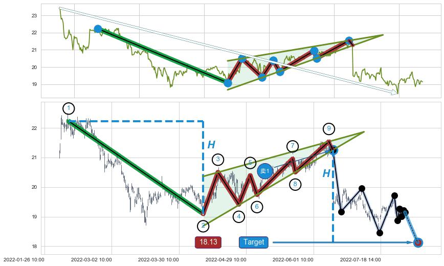 ➣ 升楔型:猜想预期下跌目标target即将达成,随后猜想强支撑来临,预期反弹上涨(均值回复)